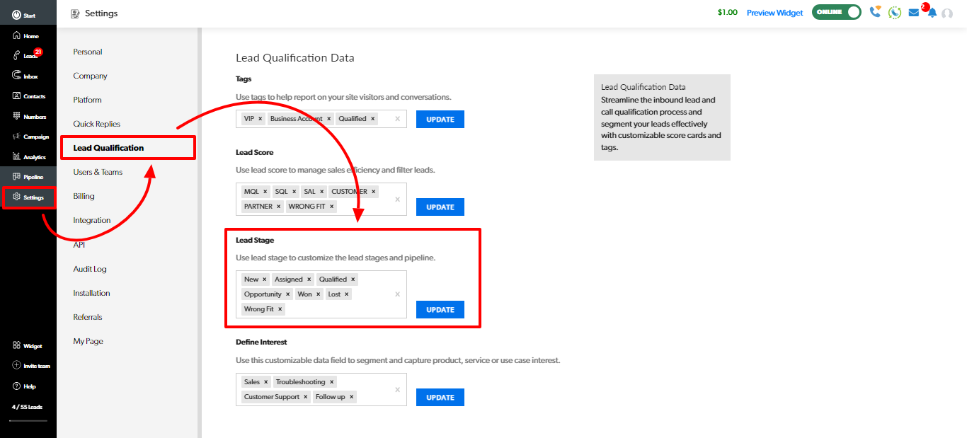 Navigate to "Settings > Lead Qualification" and add new stage within the "Lead Stage" tags.