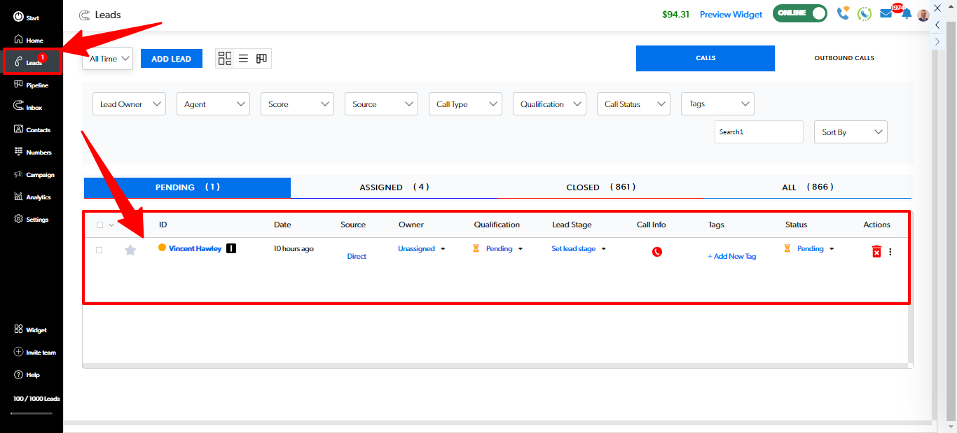 Your new lead will appear in the Leads page