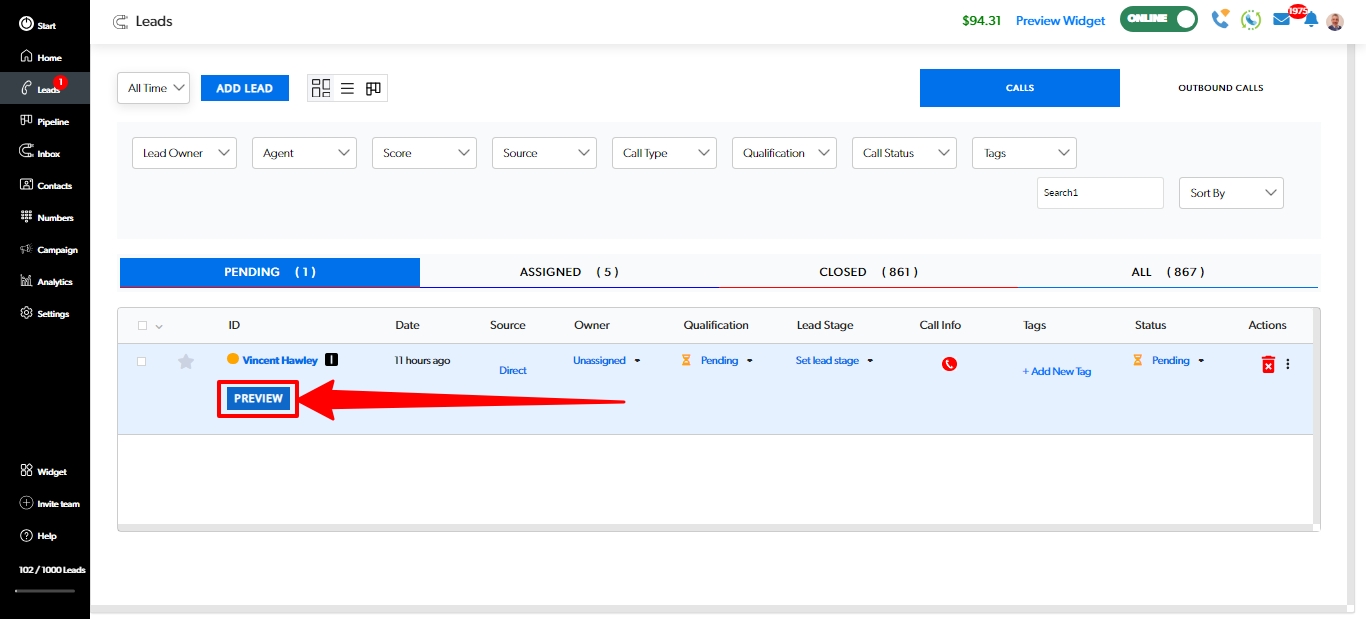 Select "Preview" to view your Lead details
