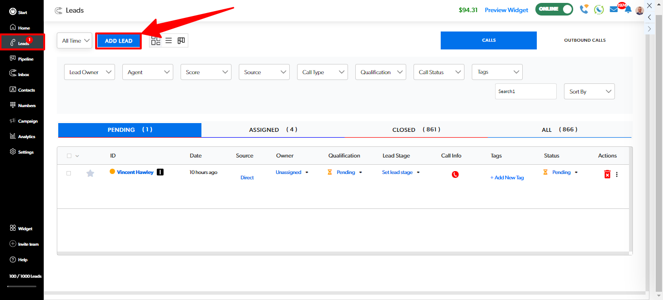 Click on the "Add Lead" button.
