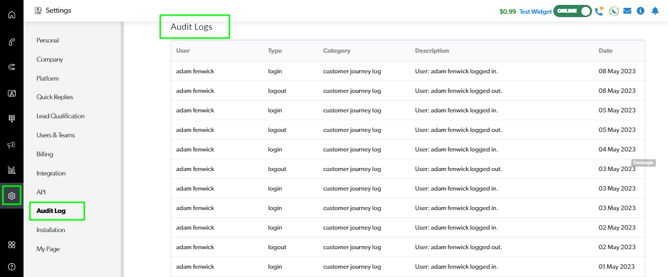 Finally, LimeCall's audit log allows you to identify key actions of your teams and users.
