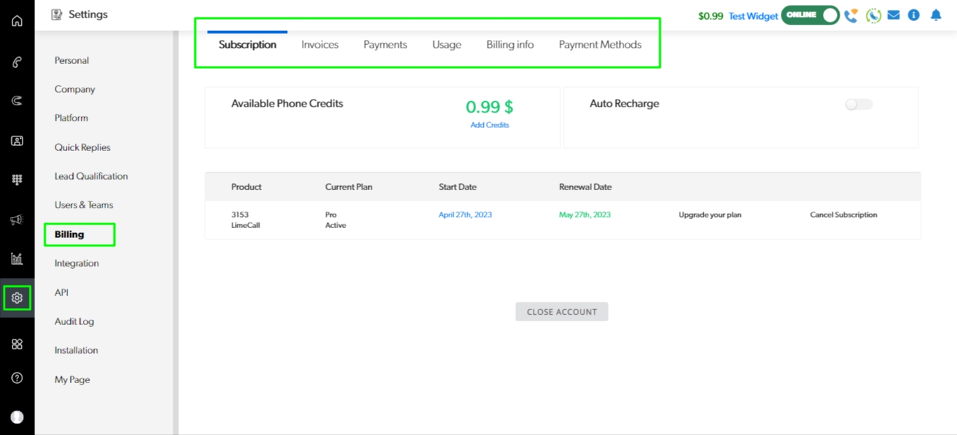 Account Usage - including credits used, Incoming / Outgoing calls, Digital Calls, Leads, SMS and Users.