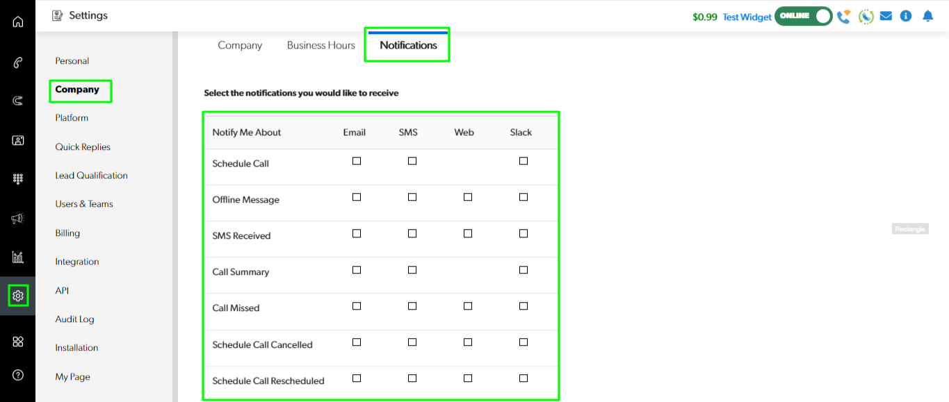 To set company notifications which you would like to receive, choose from email, SMS, web, and in app click 'save' once complete.