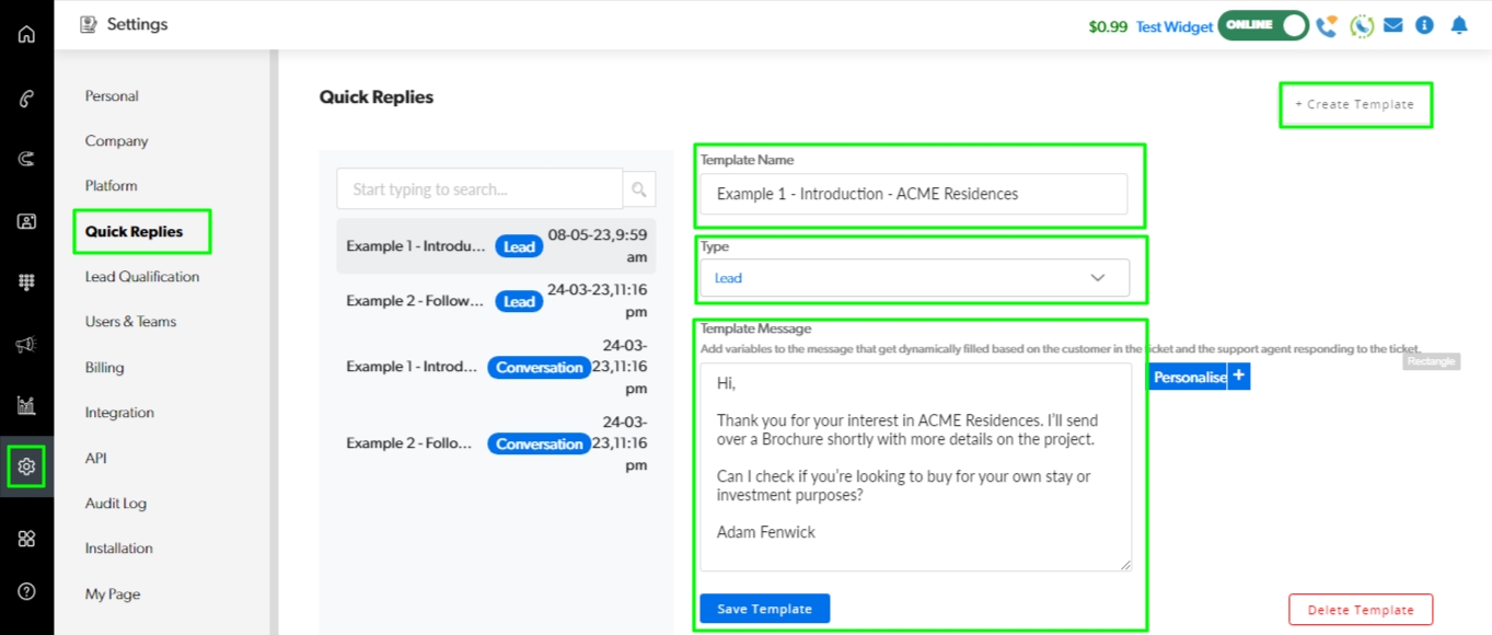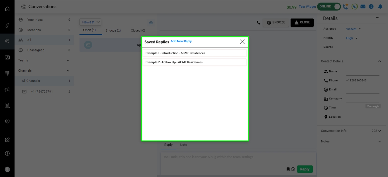Quick replies save your team valuable time when responding to Lead and customer inquiries. Create bespoke replies based on your brand identity, with the ability to create and store unlimited Quick Replies, establishing a comprehensive library of relies your team can access and send instantly.