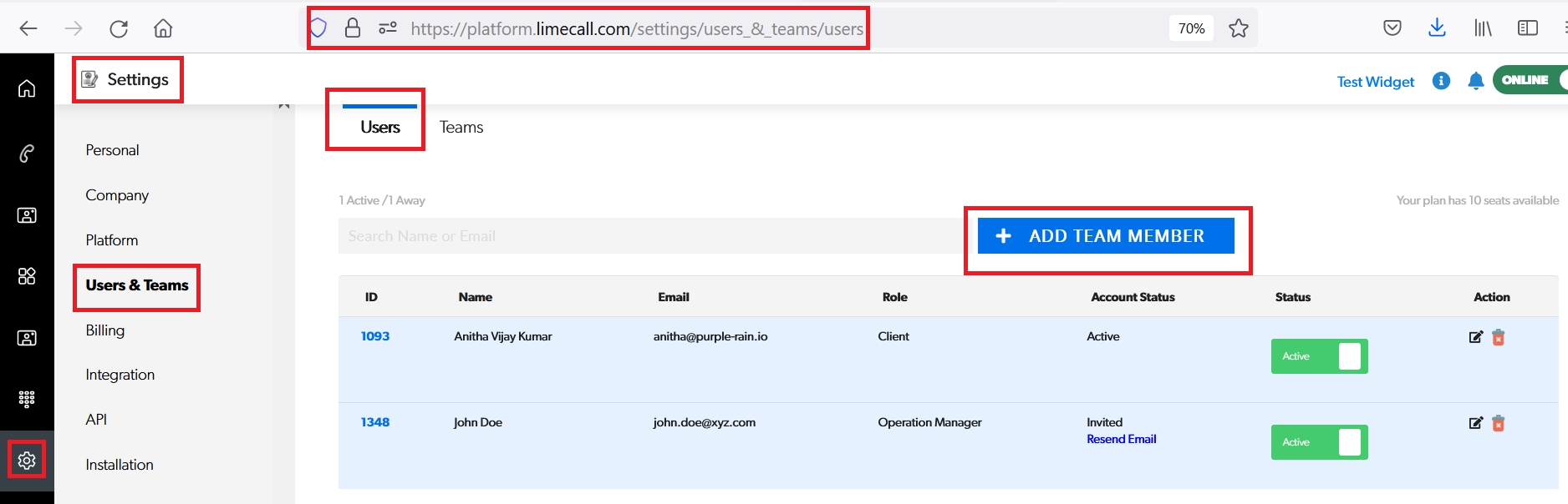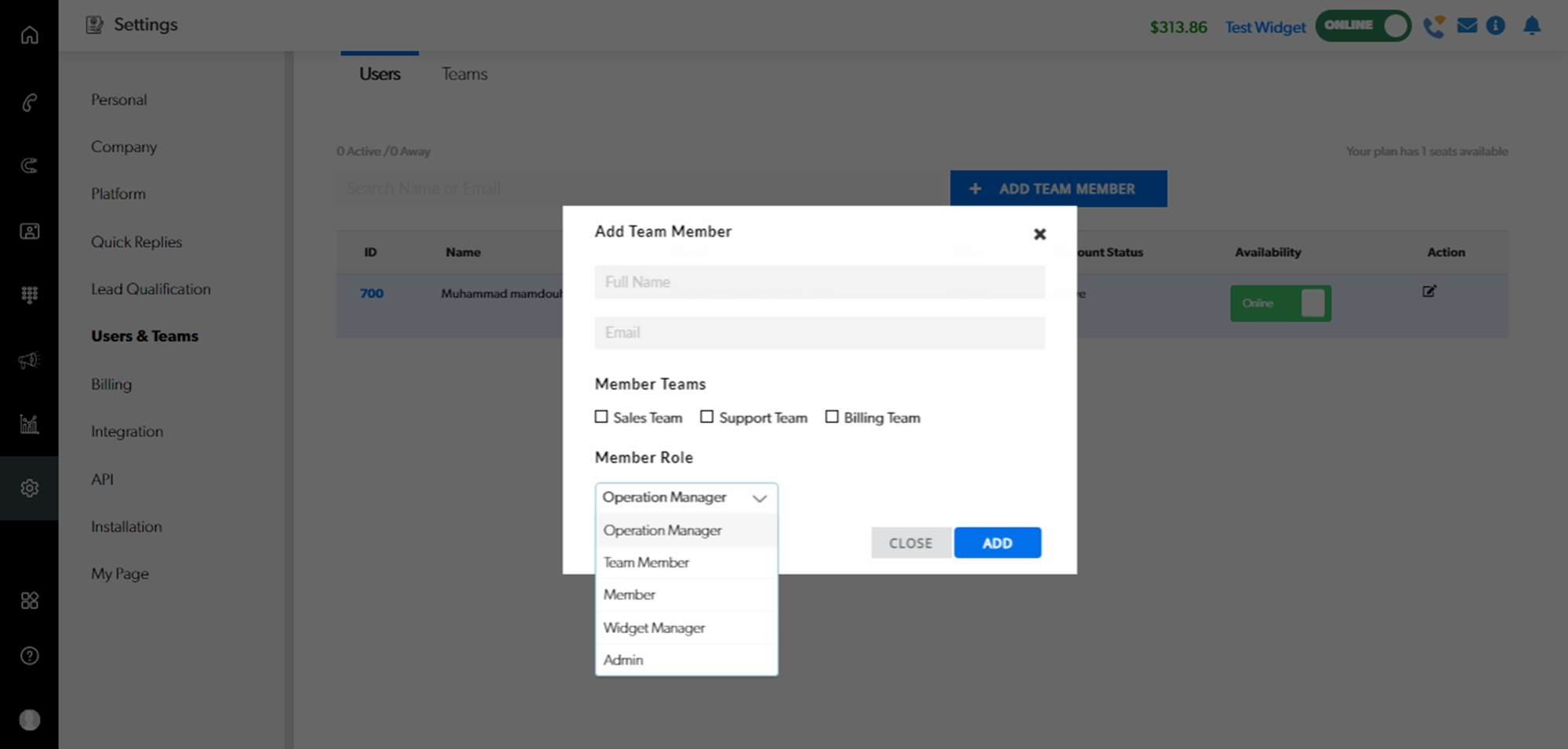 Step 2 : Click on '+ ADD TEAM MEMBER'