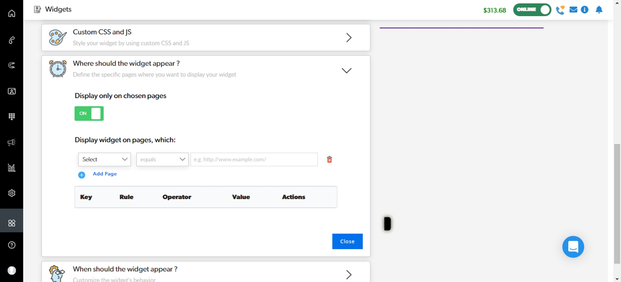 Widgets > Where should the widget appear? > Display only on chosen pages