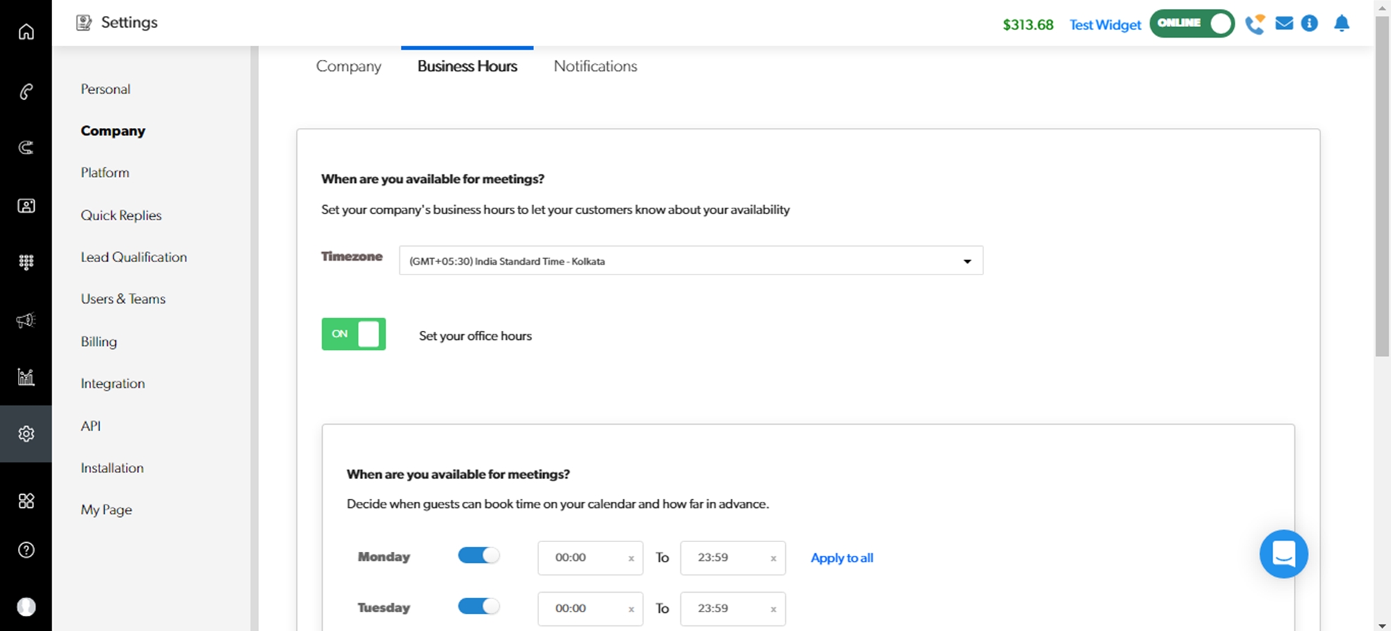 Enable business hours to let people know what times you are working and when you are available for taking calls and meetings. Calls will be auto disabled during non business hours.