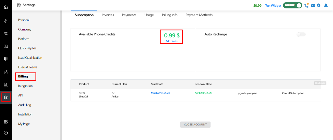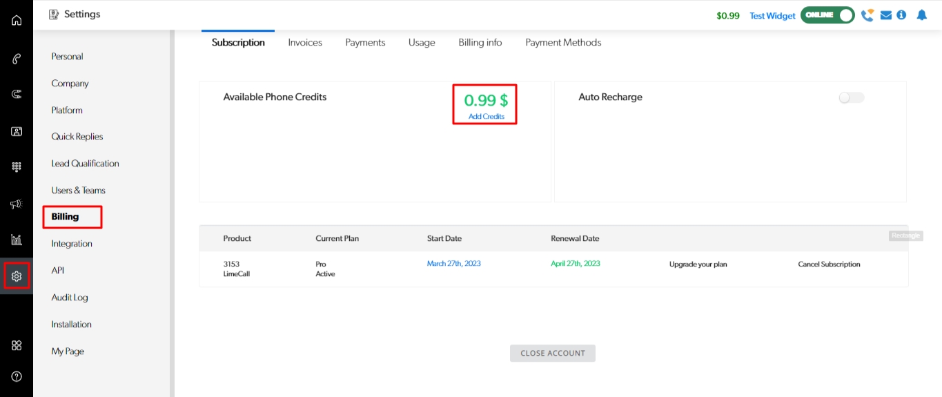 Go to Settings > Billing > Subscription > Add Credit