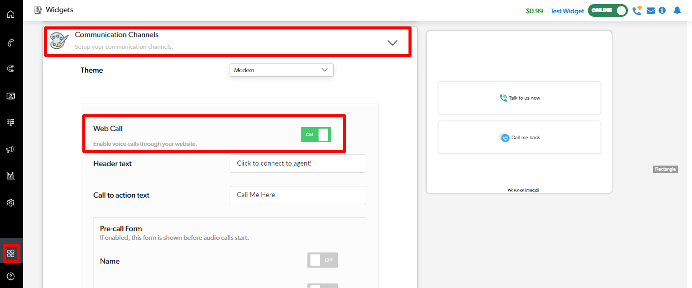 Scroll down to 'Web Calls' and ensure the option is 'ON'.
