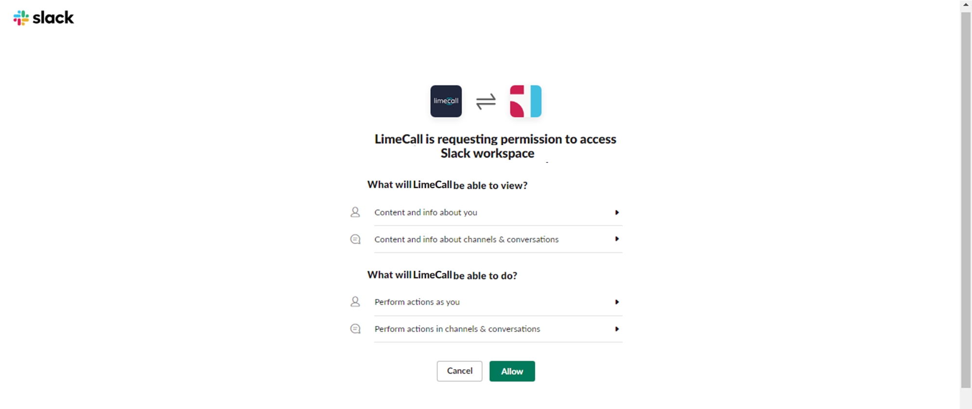 Step 3 : Click allow to provide LimeCall access to your slack workspace
