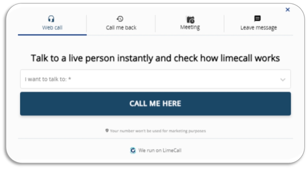 This is the default template of LimeCall, this provides all options like 'Click2Call', 'Call me back', 'Call me later', 'Leave message' which you can update according to your preferences. It consists of a simple design, as a central pop-up window.